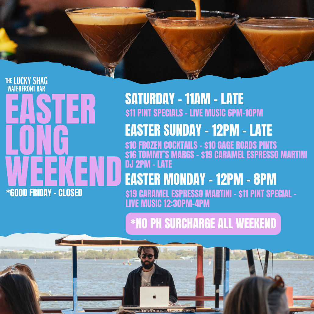 Looking for things to do this Easter long weekend in Perth? Celebrate by the Swan River at The Lucky Shag with live music, DJs and drink specials all weekend long — with no public holiday surcharge.